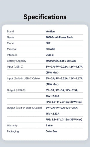 Batterie externe / powerbank 10 000 mAh à charge rapide PD35 W "Vention - Dash series"