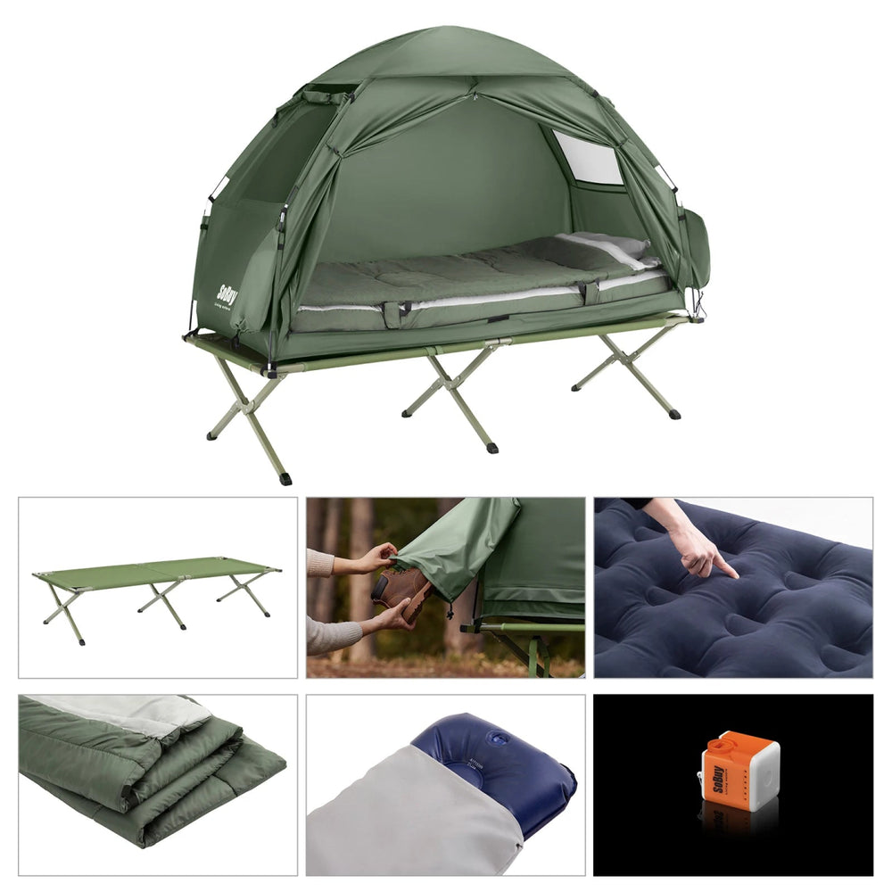 lit de camp, toit de tente, matelas pneumatique, sac de couchage et oreiller gonflable (housses assorties incluses), gonfleur à pied, sac de transport.