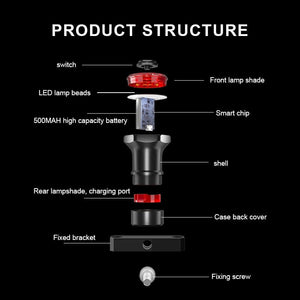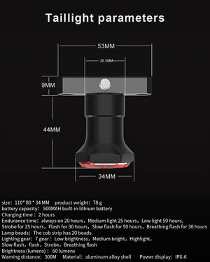 Éclairage arrière de vélo avec rechargement LED intelligent & capteur automatique IP65 "X-Tiger - WD-0201"