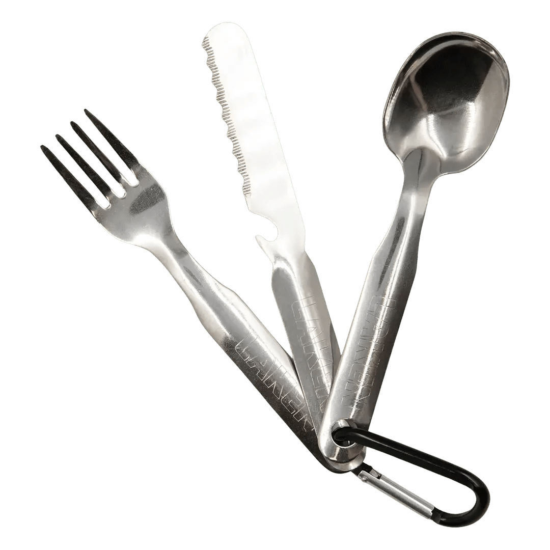 Couteau, cuillère et fourchette en acier inoxydable, très légers, de taille idéale et dotés d'un mousqueton qui les maintient ensemble et facilite le transport.