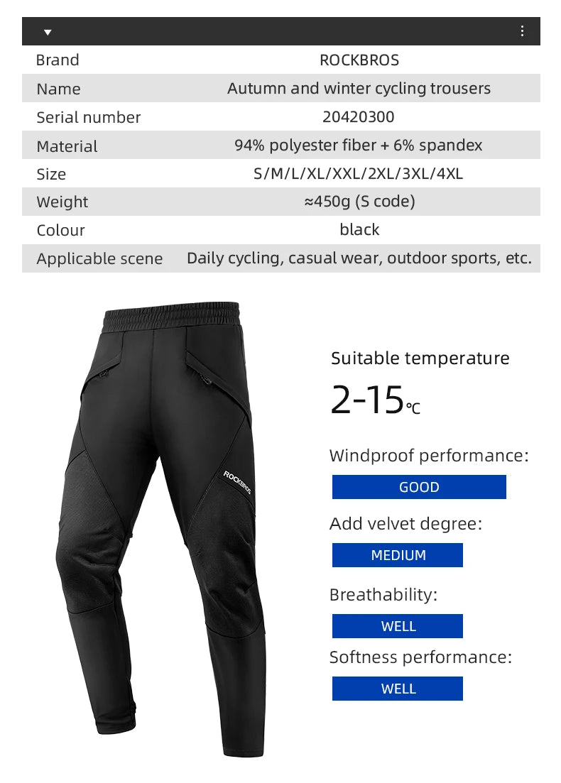 Pantalon de cyclisme thermique polaire coupe - vent pour homme "ROCKBROS - YPK series " - Planète Rando