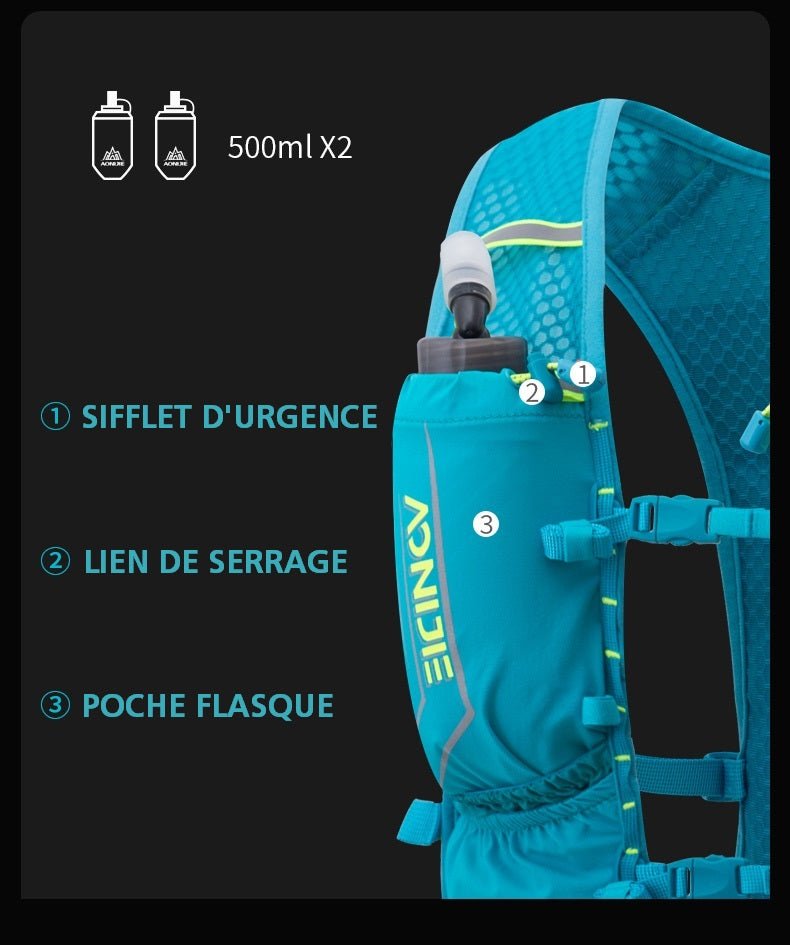 Le sac d'hydratation turquoise Aonijie C9107, fabriqué en nylon élasthanne résistant, comprend un sifflet d'urgence, une sangle de serrage et une poche pour gourde. Il est livré avec deux gourdes souples de 500 ml illustrées en haut pour plus de commodité.