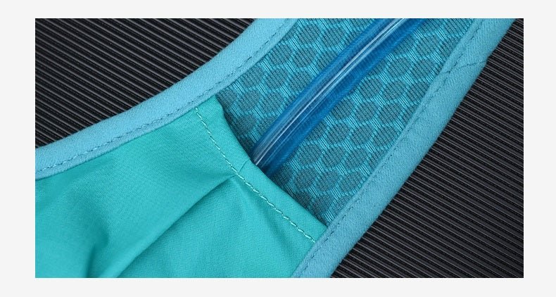 Gros plan d'un sac à dos d'hydratation AONIJIE – C9107 en Nylon Spandex turquoise, présentant une couture visible et une fermeture éclair bleue sur un fond noir texturé.