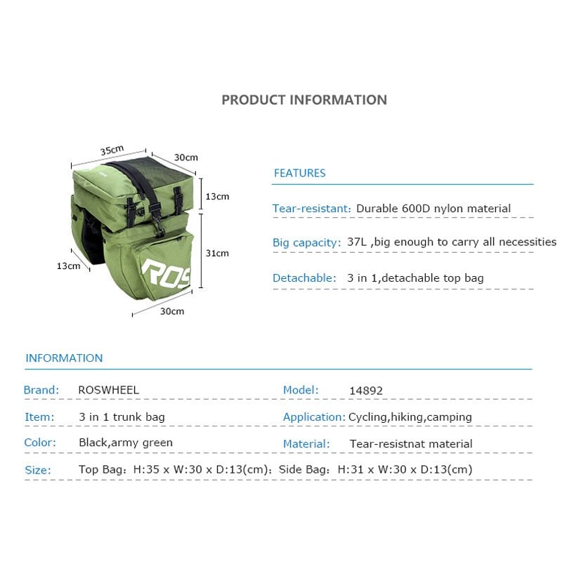 Accueil Sacoche arrière 3 en 1 pour porte-bagages de vélo 37L "ROSWHEEL – 14892"