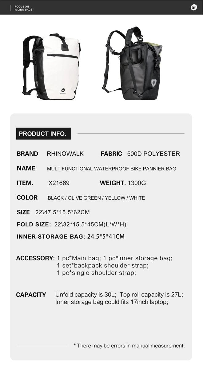 Sacoche de vélo étanche sur porte-bagages arrière "Rhinowalk - X21669 27L"